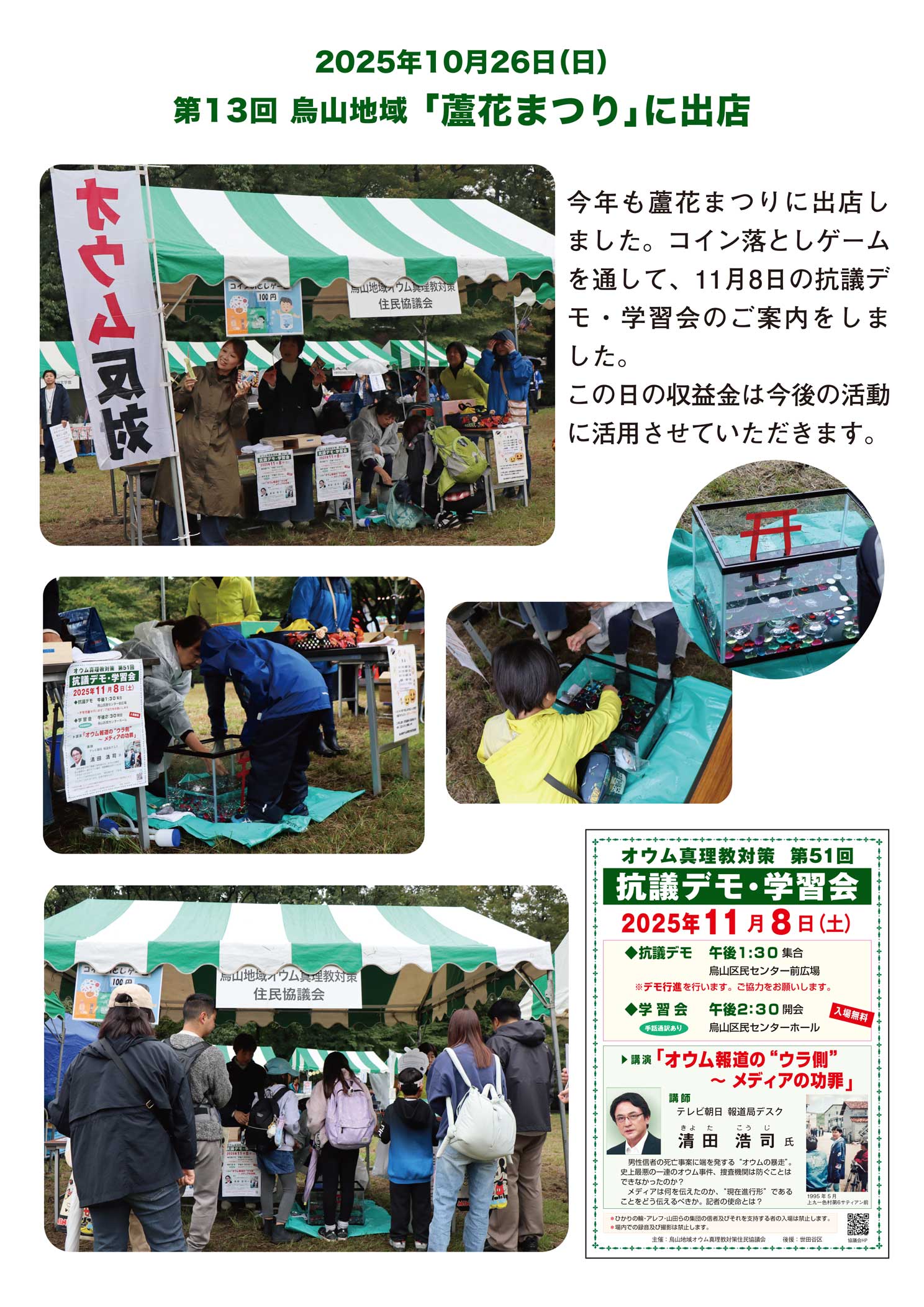 第13回烏山地域 蘆花まつりに出店 コイン落としゲームを通して、11月8日開催の第51回オウム真理教対策 抗議デモ・学習会のご案内をしました。