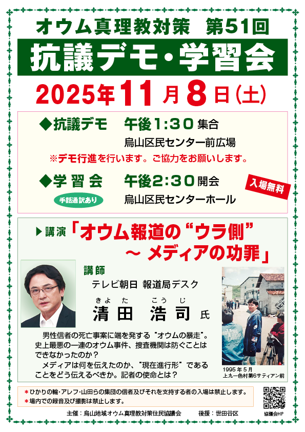 2025年11月8日(土) 第51回オウム真理教対策 抗議デモ・学習会を開催します。抗議デモ終了後、午後2時半より烏山区民会館ホールにて学習会を開催します。是非、ご参加ください。